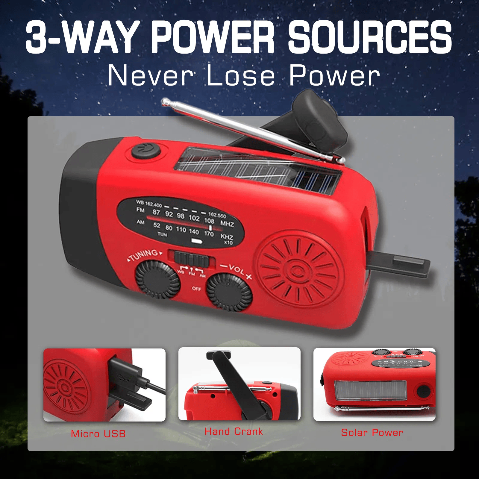 3 Power Source including Hand Crank, Solar Panel, Built-in Li-ion Rechargeable Battery, to make it easier to keep the emergency radio running during a prolonged situation where power is off and batteries have been used up.